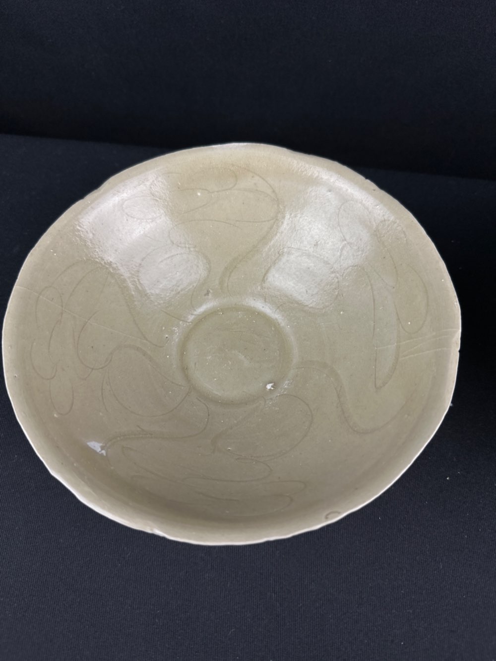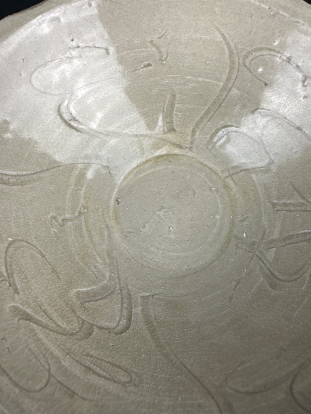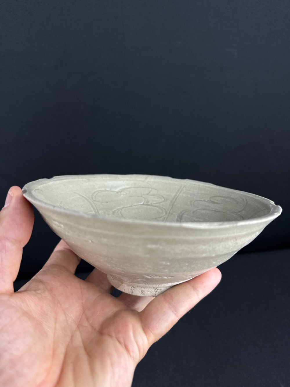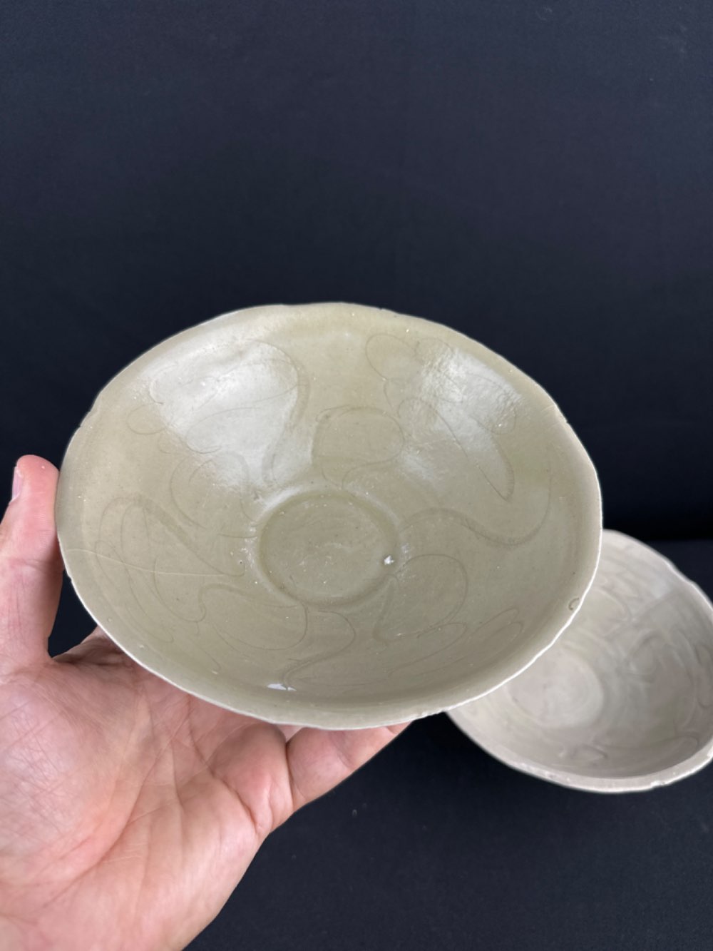 It is coated in a greenish qingbai type of glaze, the foot remains unglazed showing the pale porcelaneous body. The inner surface is decorated with incised floral patterns with small pieces of kiln grit embedded within the glaze. It has a slightly "frosted" feel of the glaze because laying in the sea wreck for hundreds of years.