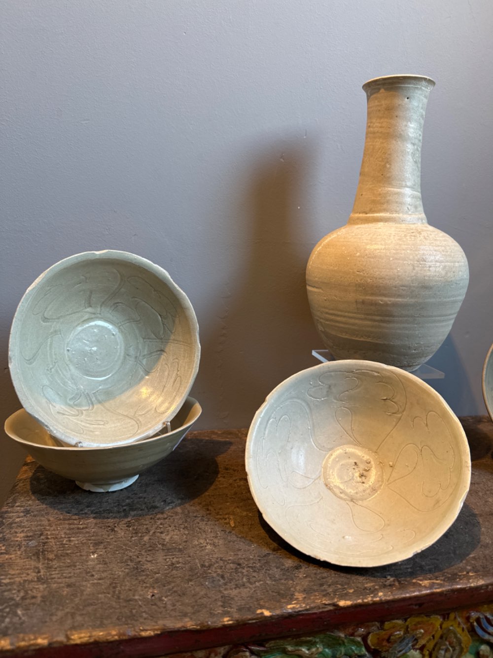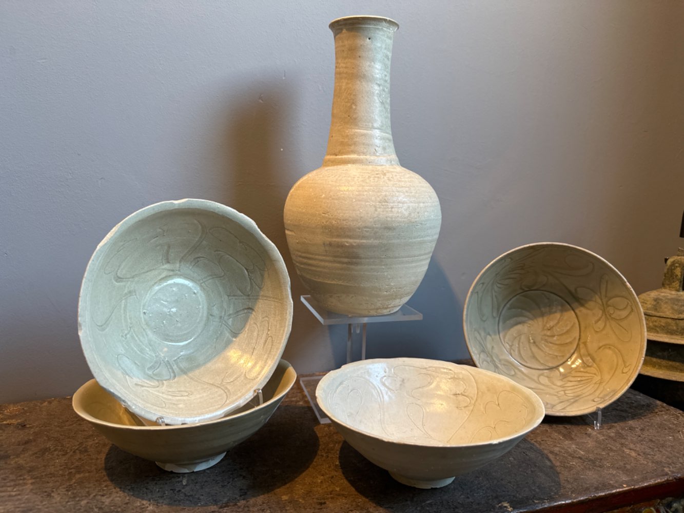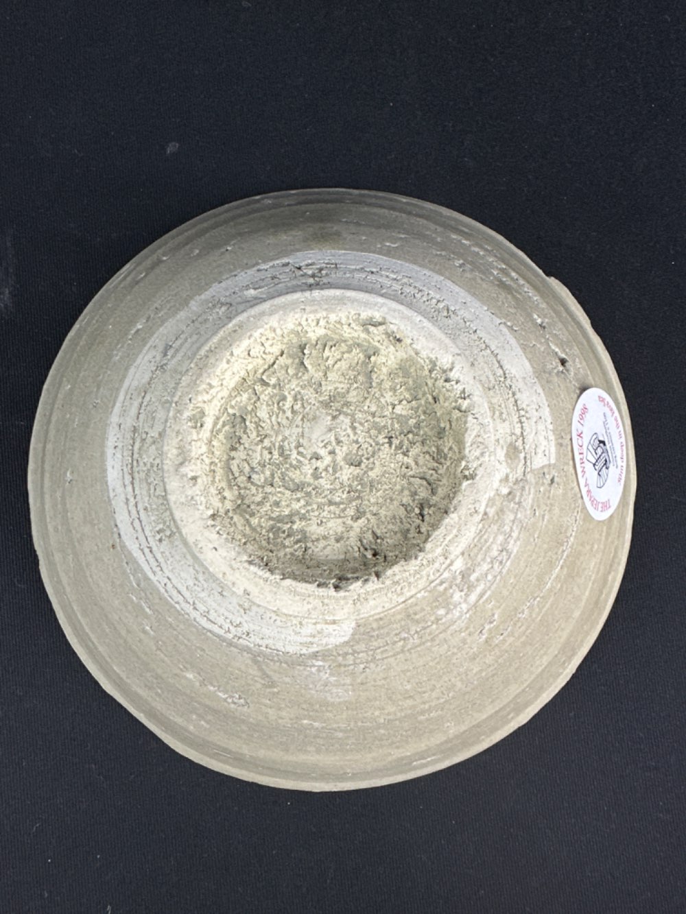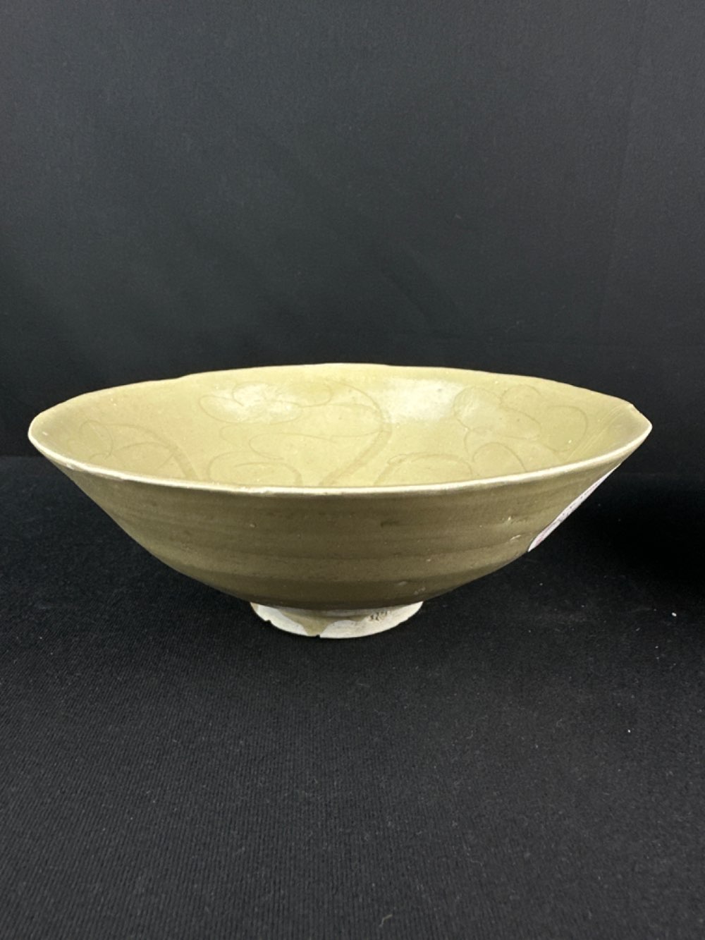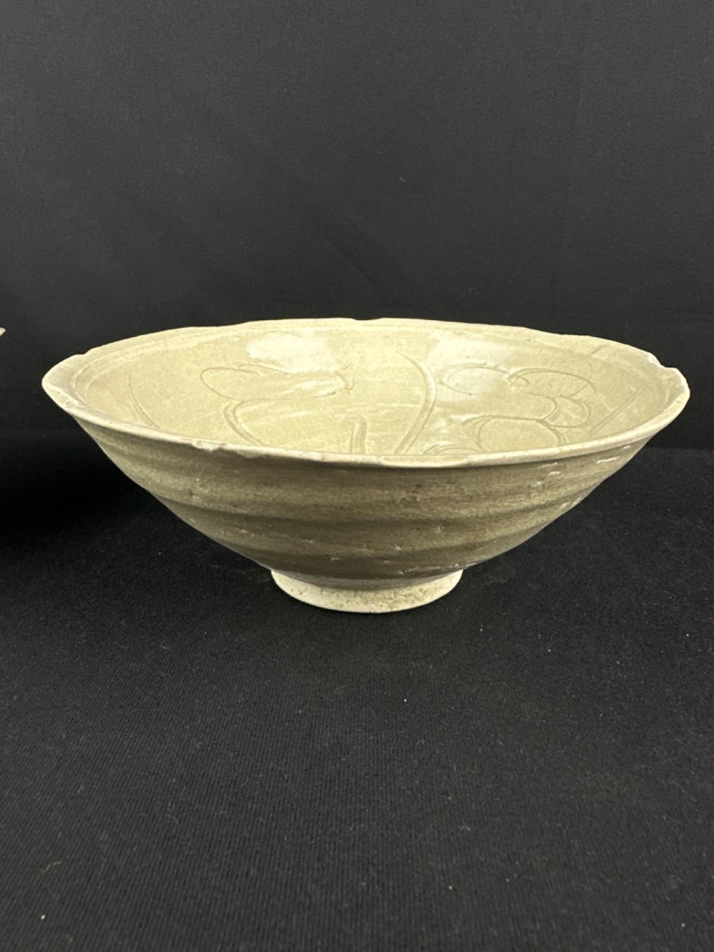 It is coated in a greenish qingbai type of glaze, the foot remains unglazed showing the pale porcelaneous body. The inner surface is decorated with incised floral patterns with small pieces of kiln grit embedded within the glaze. It has a slightly "frosted" feel of the glaze because laying in the sea wreck for hundreds of years.