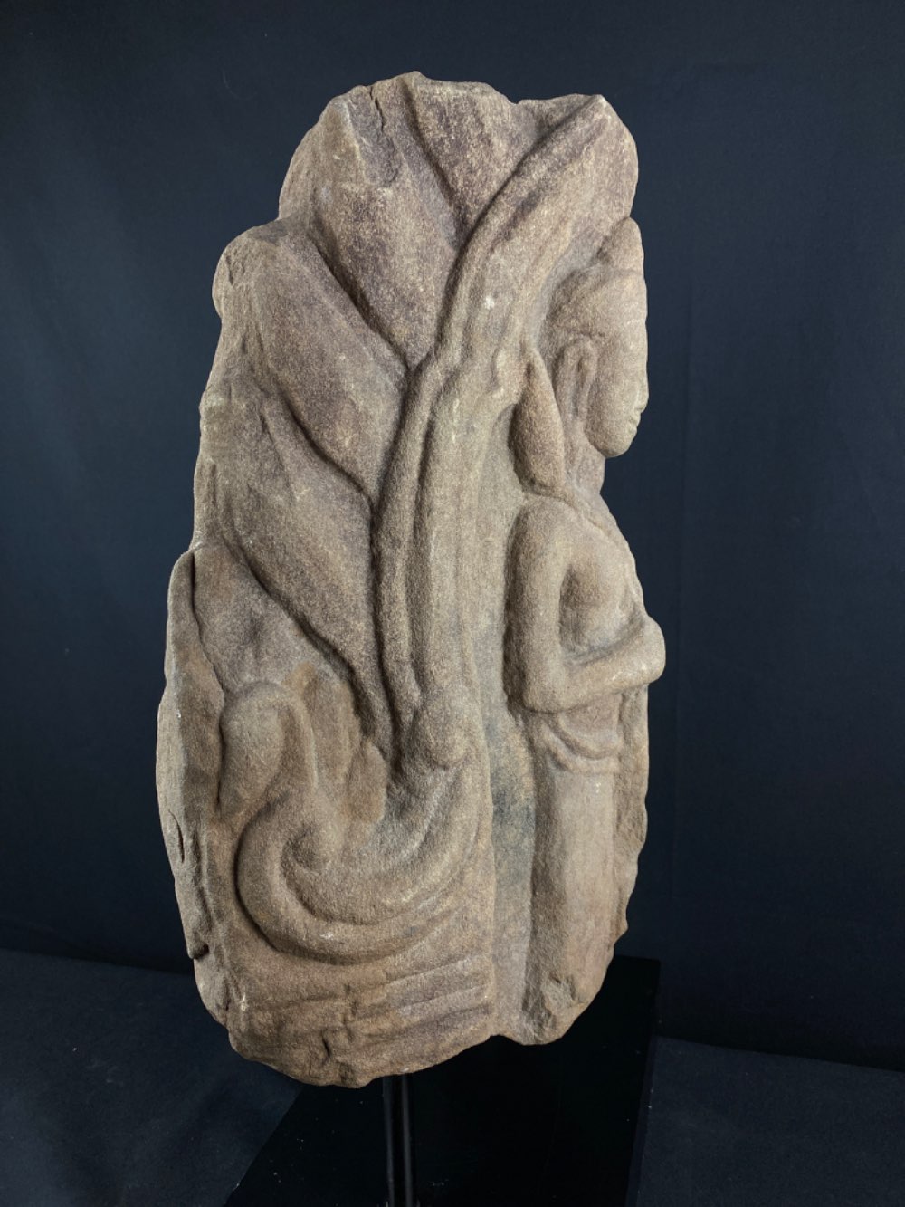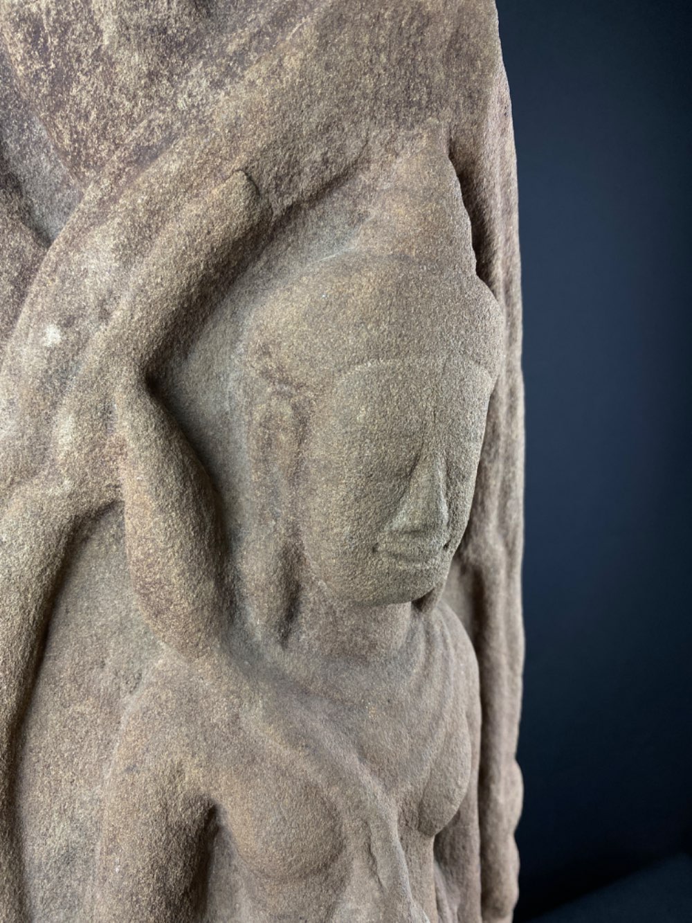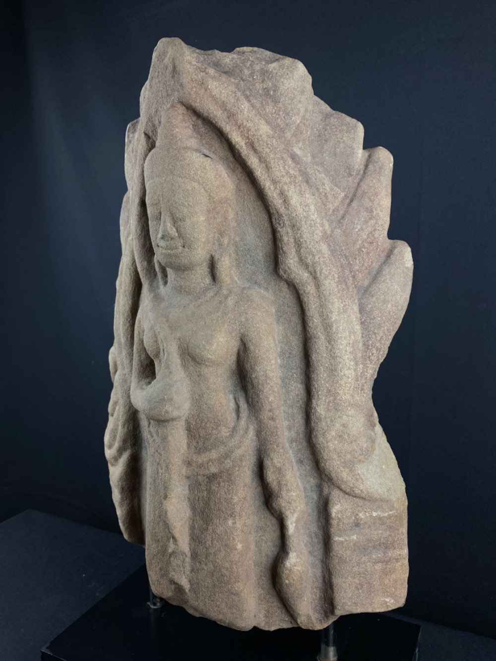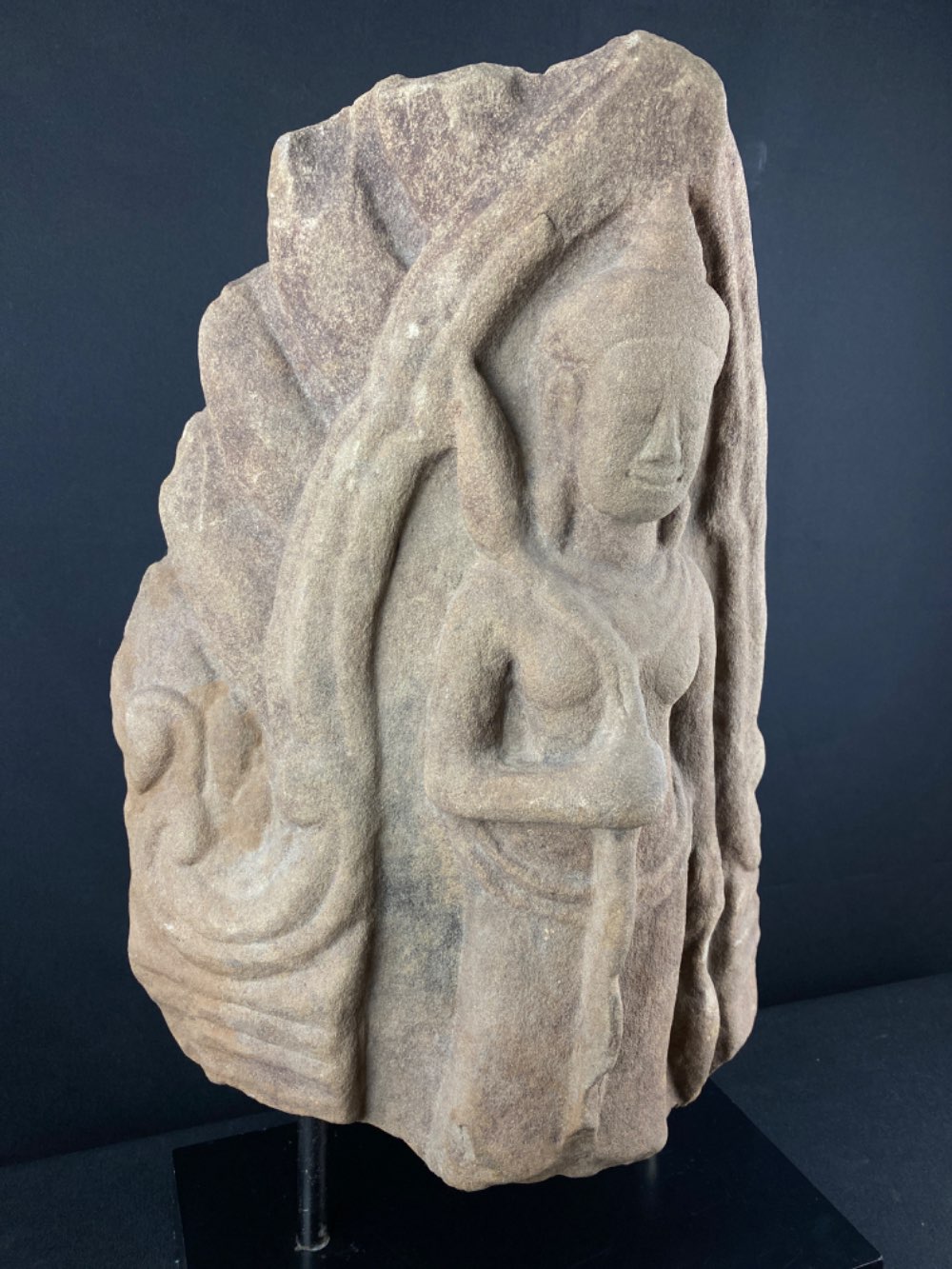 Very nice Sandstone fragment of an Apsara from Cambodia, 12-13th century