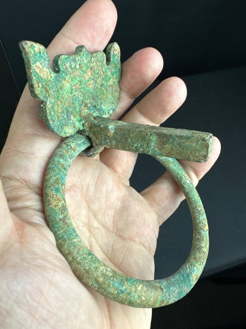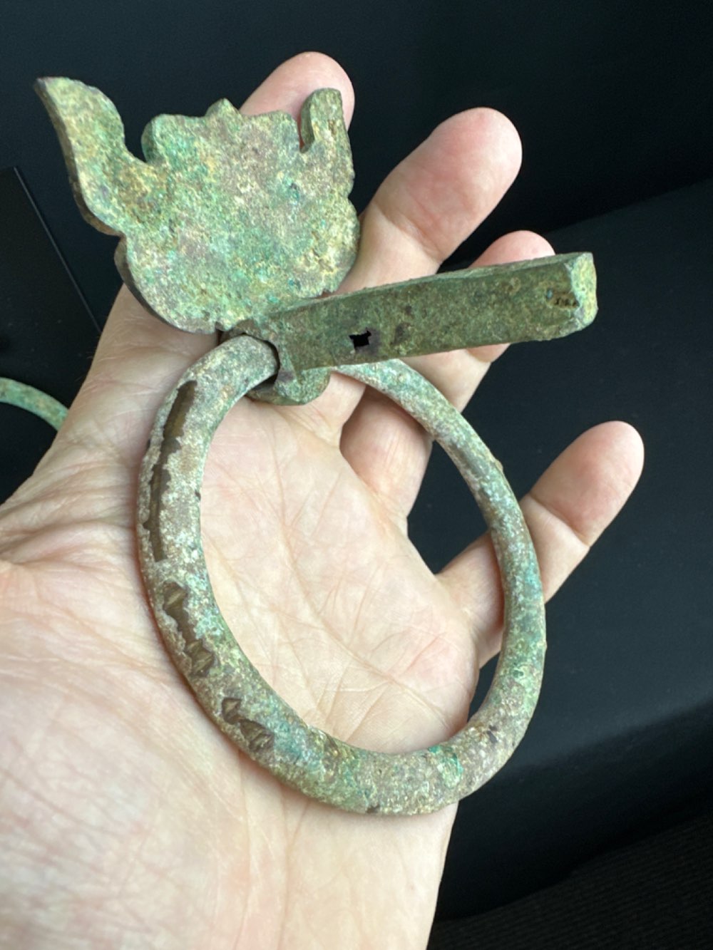 • These handles were most likely fixed on both sides to a thick wooden box in a tombe as the fixtures at the back are thick and relatively long. One has more oxidation then the other which makes it likely that they were on each side of the box or coffin.