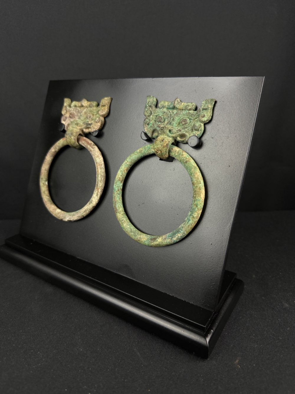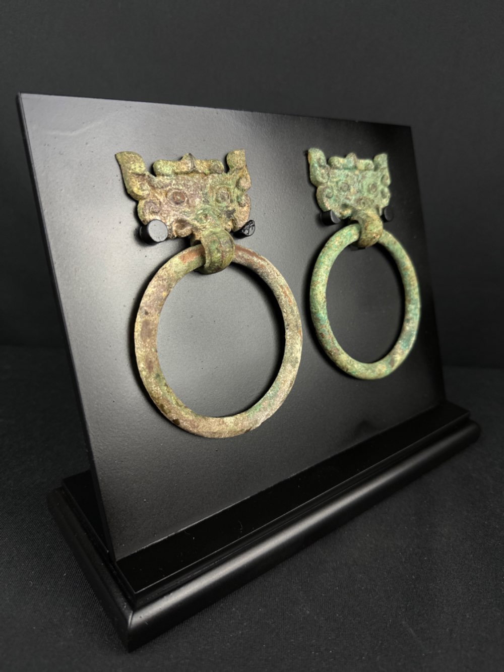 • A beautiful matched pair of bronze handles with mask faces known as taoties. These taoties are characteristically shown with a forward facing and symmetrical visage. The ring handle is attached to the loop formed by the creature’s snout.