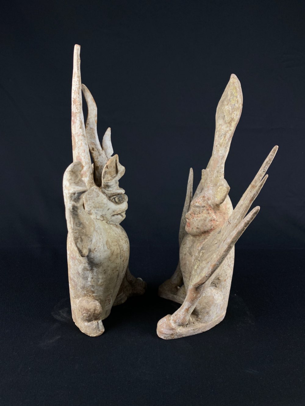 • The inclusion of fantastic animal guardians as part of the retinue of tomb figures began in the Northern Wei dynasty (A.D. 386–534) and continued into the Tang dynasty. Also called earth spirits, or zhenmushou (grave-quelling beasts), these guardians took the form of fantastic hybrid creatures composed of various animal and sometimes human elements and were placed in the tomb in pairs to ward off any malevolent beings who threatened to intrude.