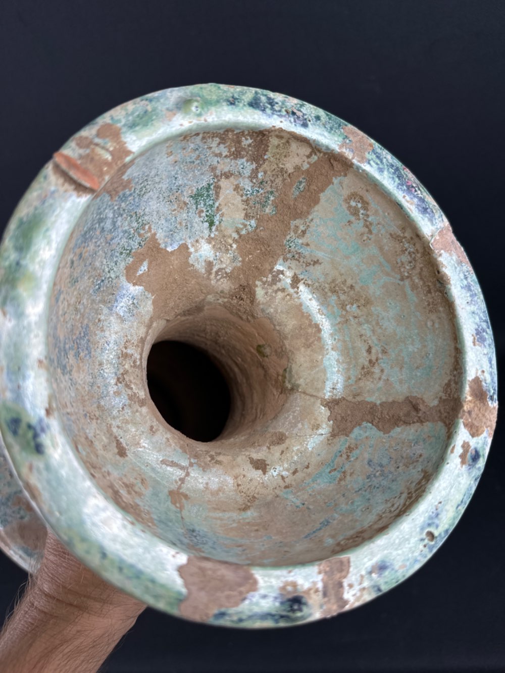Distinctive Glaze: The pottery was characterized by a striking green lead glaze that displayed an iridescent sheen or iridescence. This iridescent effect created shifting colors or a play of colors, resembling a spectrum of hues, such as blues, purples, and greens, depending on the angle of light.