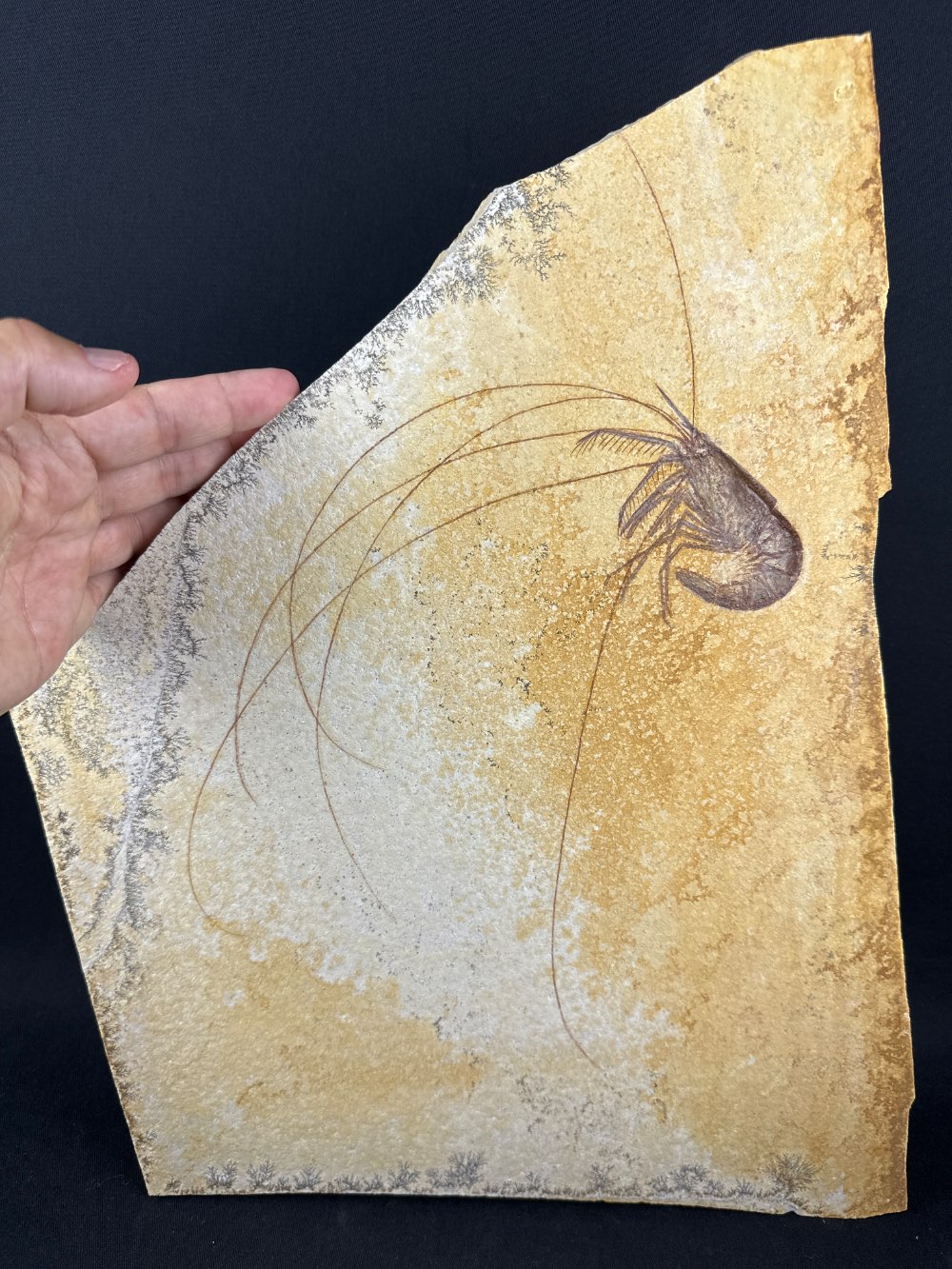 Fossil shrimp (Aeger tipularius) from Jurassic Solnhoften limestone, Germany. A superbly-preserved example (note details on the antennae and legs) with aesthetic matrix showing complimentary colours and even some manganese dendrites on the edges.