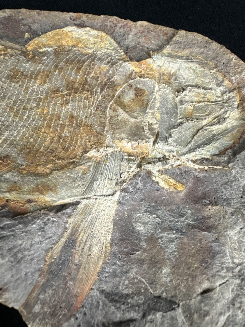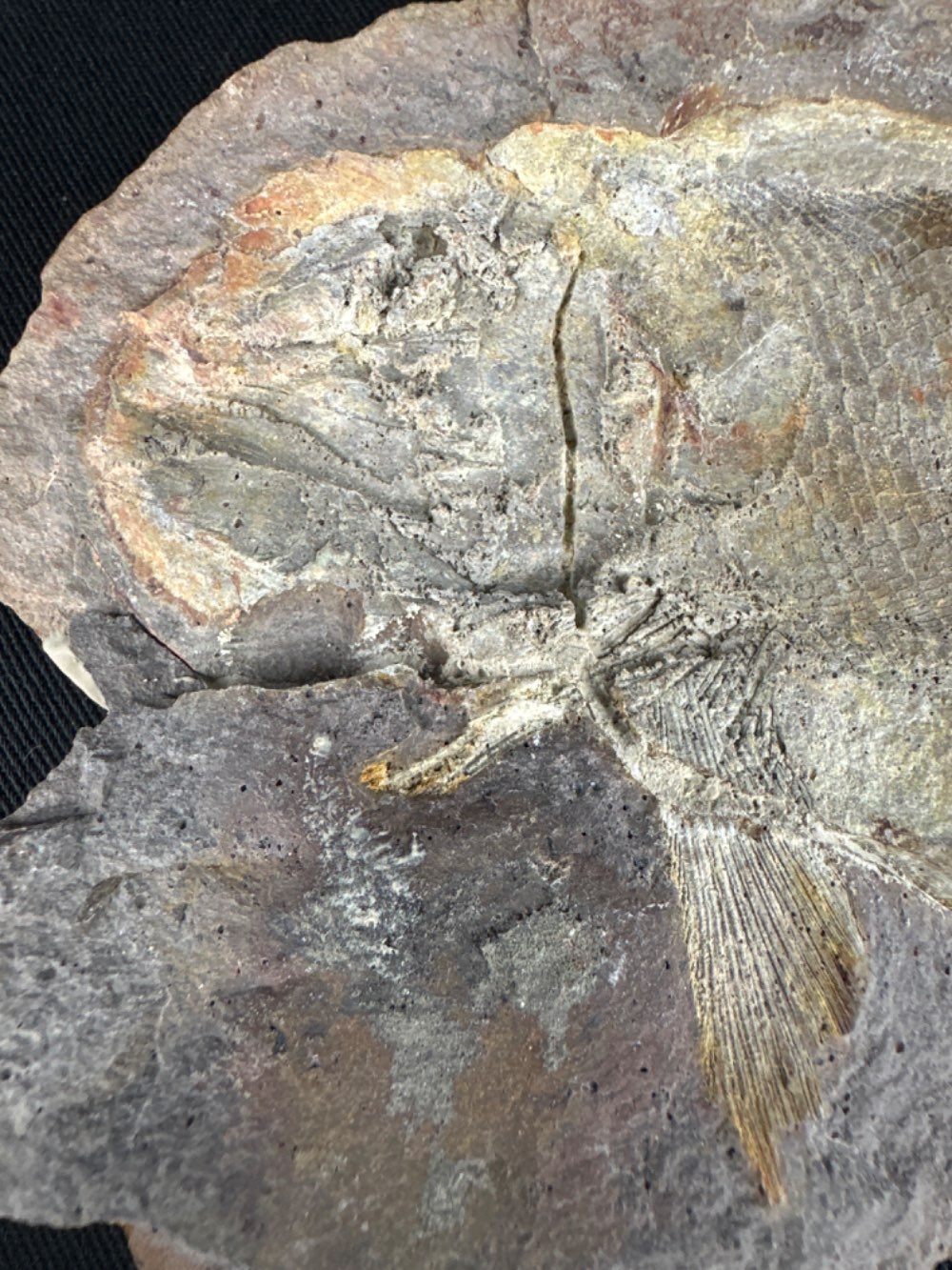 • Complete preserved fish in a nodule, the eyes, fins and scales are clearly shown. Here is a beautifull, all natural specimen which was partly broken en rejoined.