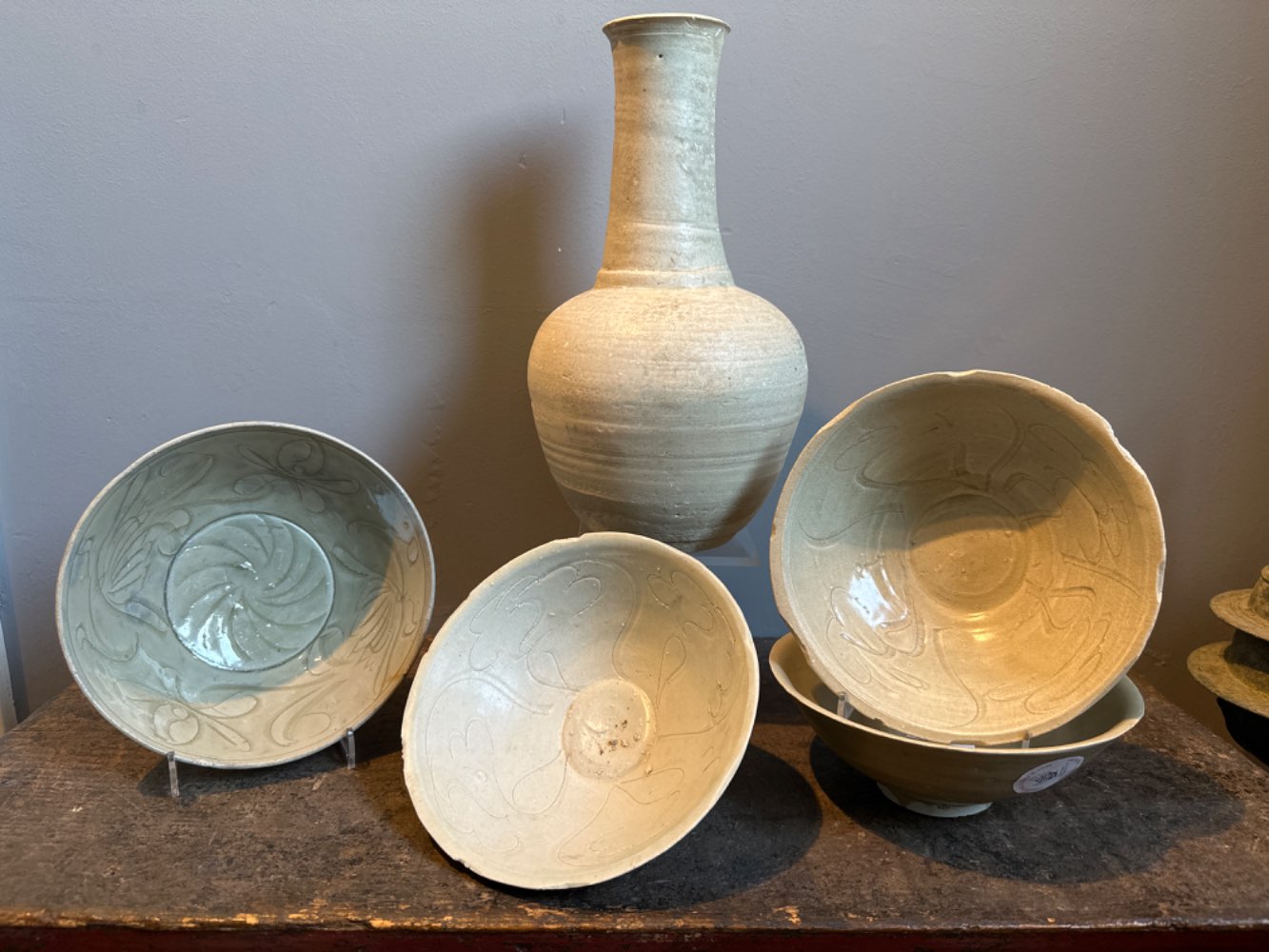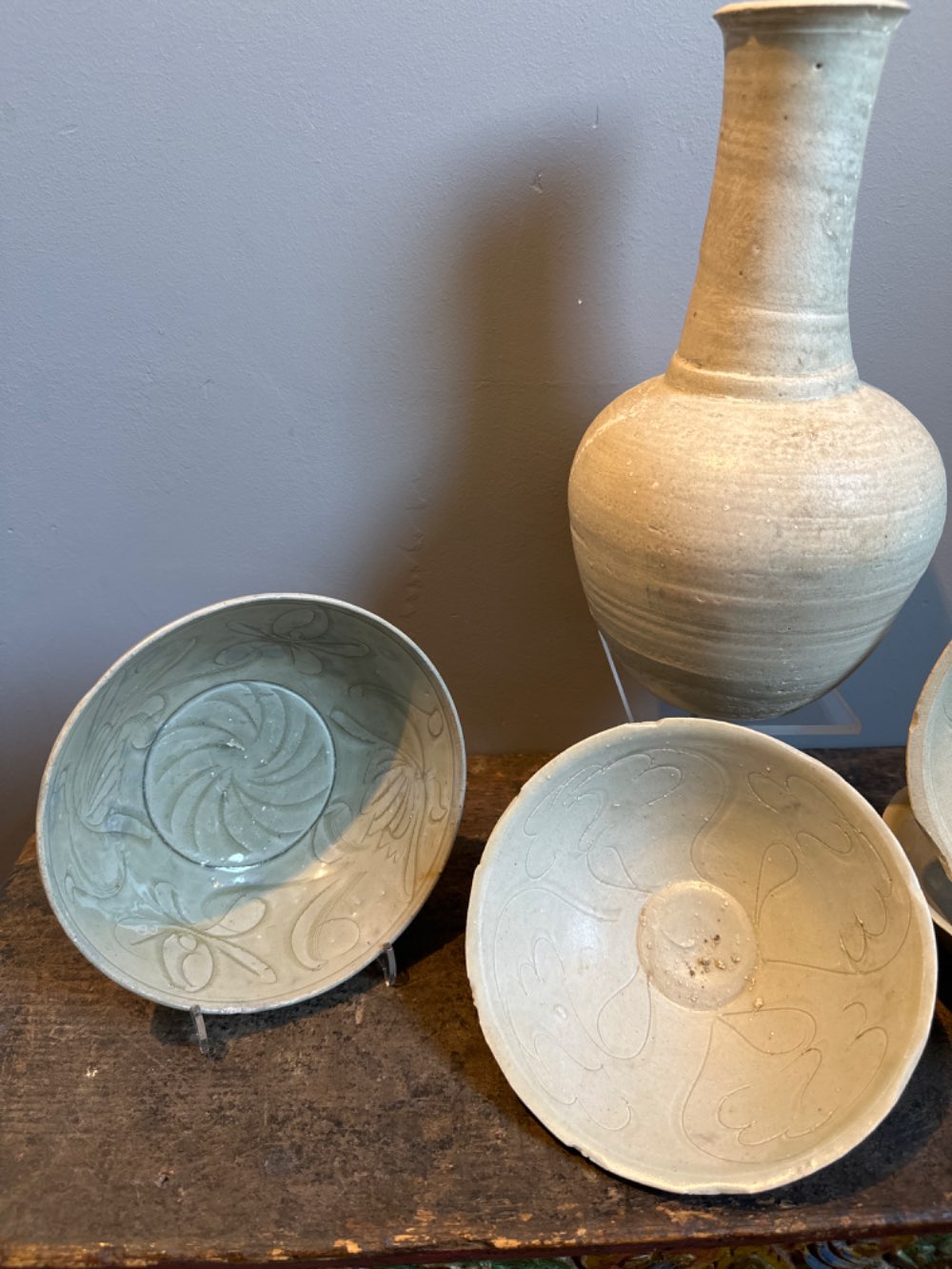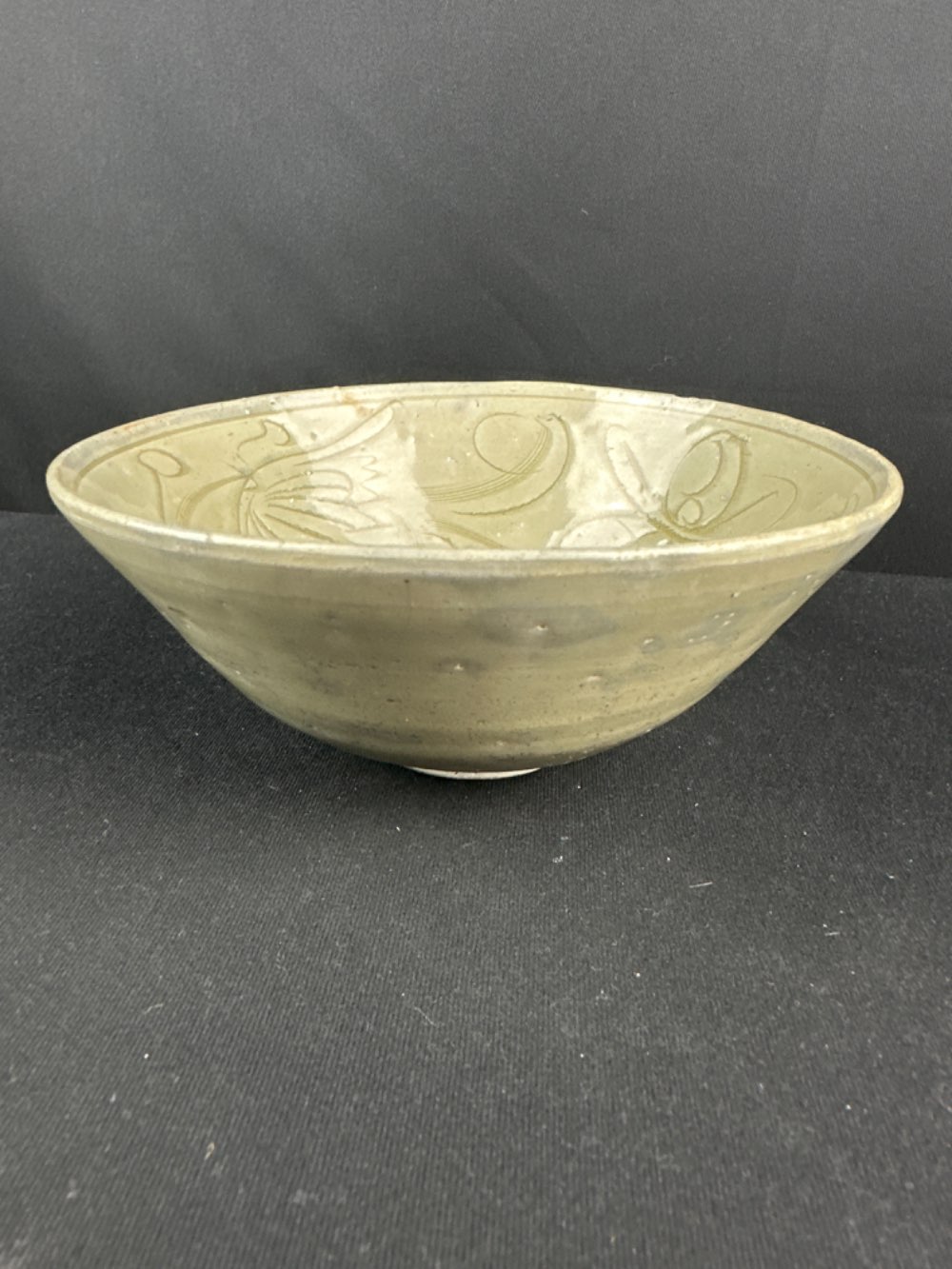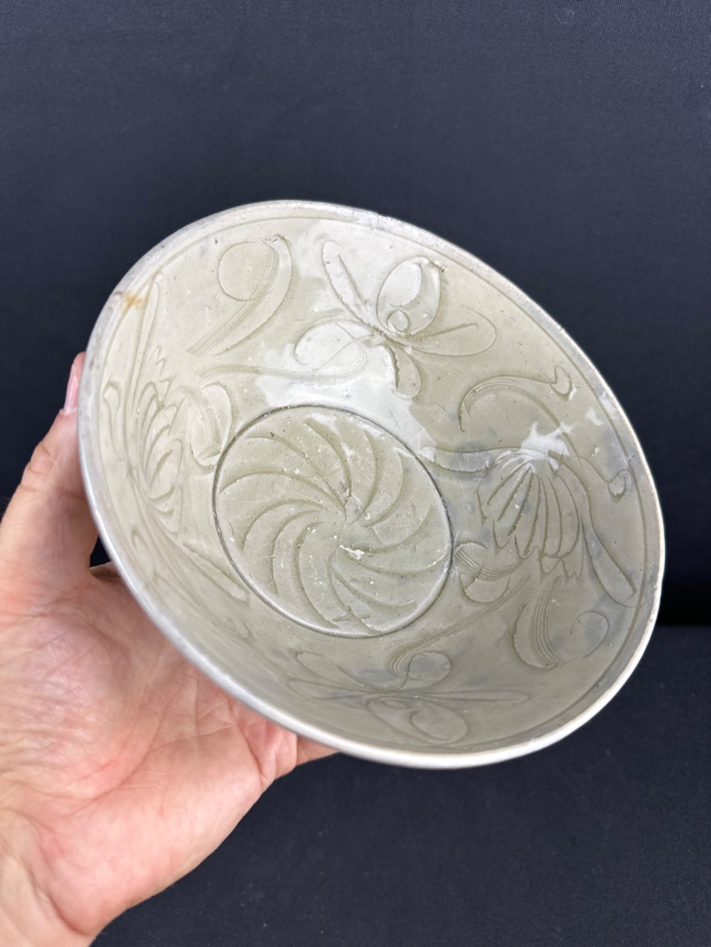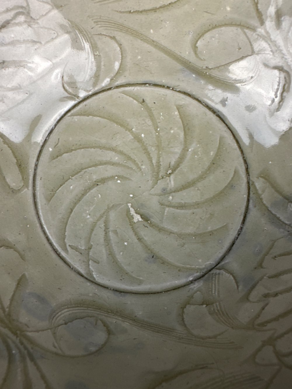 It is coated in a yellowish-green qingbai type of glaze, the foot remains unglazed showing the pale porcelaneous body. The inner surface is decorated with incised floral patterns with small pieces of kiln grit embedded within the glaze. It has a slightly "frosted" feel of the glaze because laying in the sea wreck for hundreds of years.
