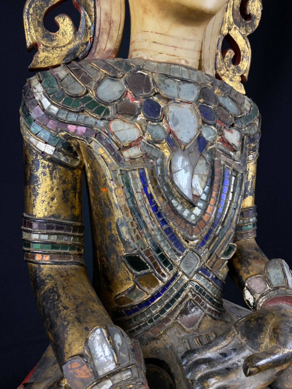 • This style of Buddha statue, also referred to as the Royal King Buddha has lots of  embellishments. The Jambhupati style traditionally wears a conical crown with earrings and jewels around the arms, neck, waist and legs and embellished with coloured glass mosaics.
